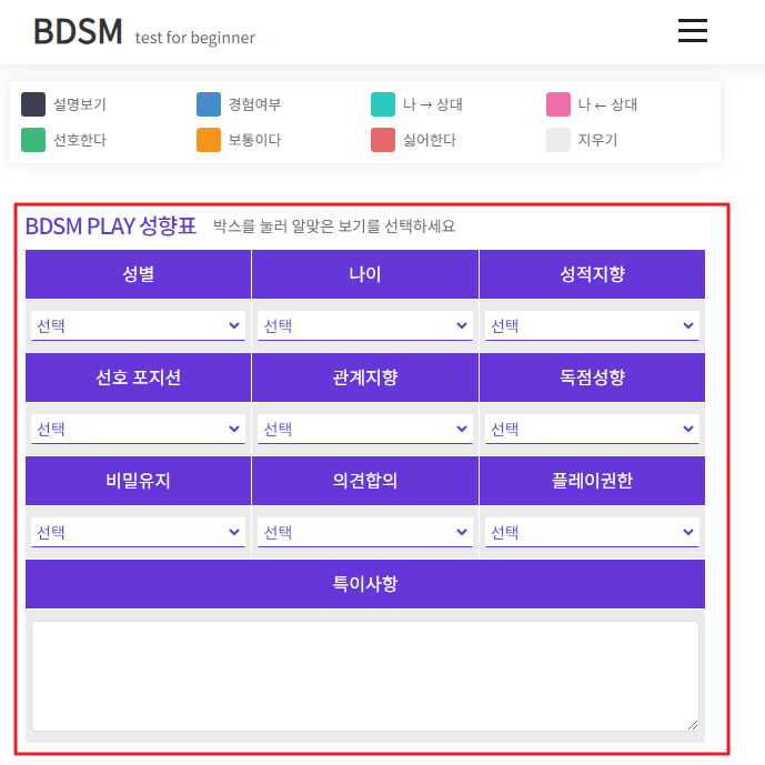 아래에서 더 자세한 항목을 통해 나의 BDSM PLAY 취향표를 작성해볼수 있습니다.